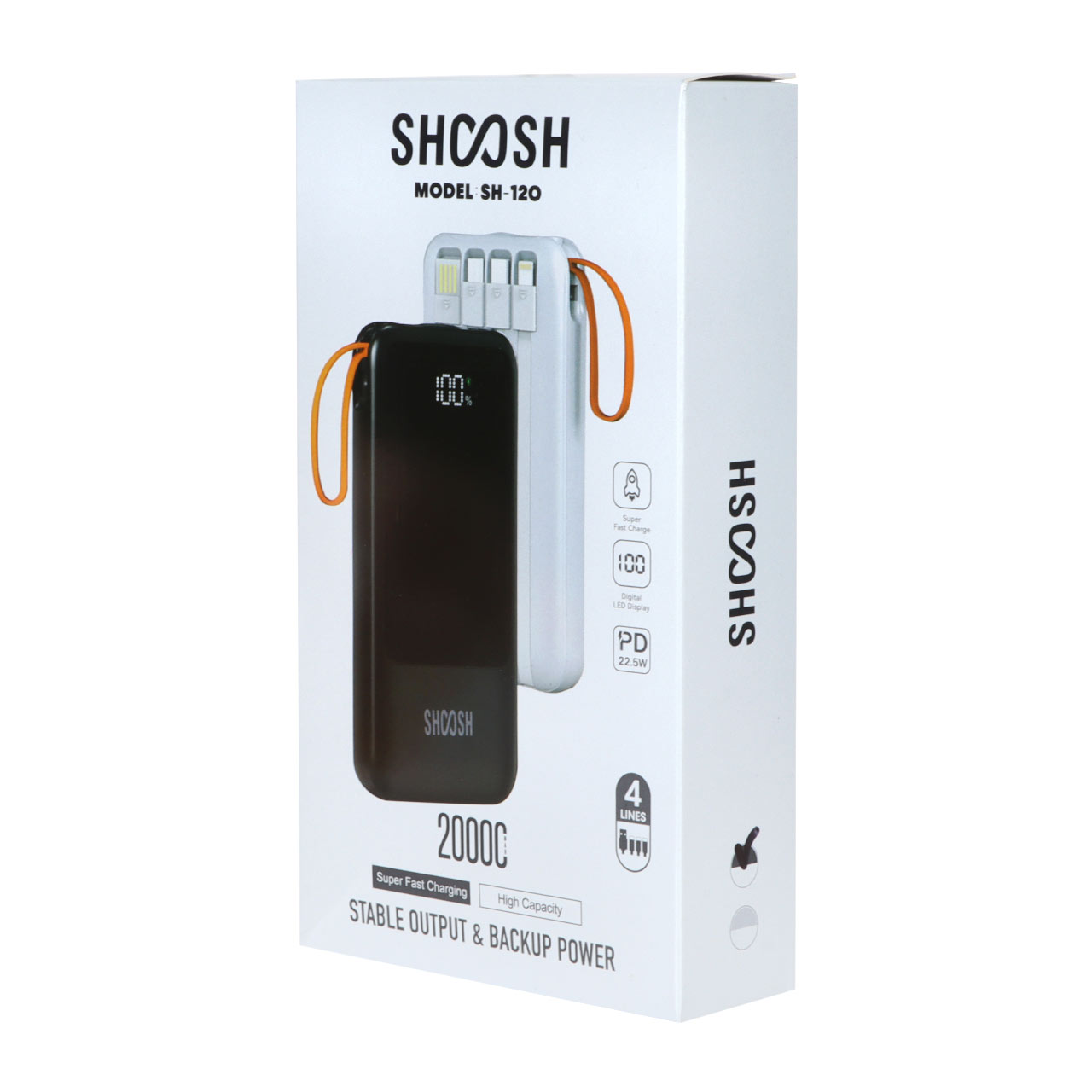 پاوربانک 20/000 shoosh مدل sh_120 به همراه یک عدد کابل شارژ 25cm سوپر فست شارژ ارائه میگردد. این محصول با داشتن 3 لاین کابل خروجی درونی و دو درگاه بیرونی با پشتیبانی از انواع پروتکلهای شارژ سریع و ایمن بهترین همراه شما در خارج از منزل، محل کار و یا هنگام سفر خواهد بود. پاوربانک shoosh با برخورداری از شارژ هوشمند به راحتی میتواند همزمان 5 دستگاه را شارژ کند. با استفاده از این پاوربانک میتوانید تمامی انواع گجتهای هوشمند مانند دوربین، تبلت، گوشی، اسمارت واچ و غیره را در طول روز به صورت سوپر فست شارژ کنید. لازم به ذکر است که تمام لاینها و خروجیهای پاوربانک shoosh مدل sh_125 شارژ را به صورت سوپر فست شارژ انجام میدهند.